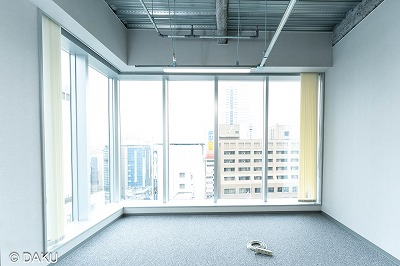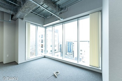 窓面前面ガラス張りで採光抜群の室内です。フロアによってハーフセットアップ(造作の会議室の机と椅子のみ付く)とフルセットアップ(造作と家具付)と通常の事務所使用のタイプがあります。業種等もご相談可能です。
